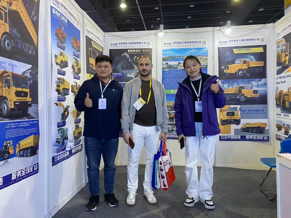 展會(huì)現(xiàn)場(chǎng)超熱鬧,山東昌松工程機(jī)械的展位前,中外客戶都來(lái)點(diǎn)贊。背景里的產(chǎn)品海報(bào)特吸睛,展示的工程機(jī)械性能強(qiáng)、技術(shù)新。